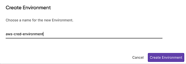 - 「Create Environment」画面で「aws-cred-environment」と入力して、[Create Environment]をクリックします。