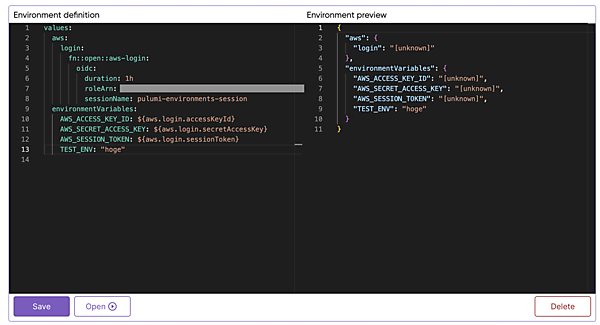 $ esc env get aws-cred-environment Value { "aws": { "login": null }, "environmentVariables": { "AWS_ACCESS_KEY_ID": null, "AWS_SECRET_ACCESS_KEY": null, "AWS_SESSION_TOKEN": null, "TEST_ENV": "hoge" } } Definition values: aws: login: fn::open::aws-login: oidc: duration: 1h roleArn: arn:aws:iam::*** sessionName: pulumi-environments-session environmentVariables: AWS_ACCESS_KEY_ID: ${aws.login.accessKeyId} AWS_SECRET_ACCESS_KEY: ${aws.login.secretAccessKey} AWS_SESSION_TOKEN: ${aws.login.sessionToken} TEST_ENV: "hoge" - 「esc env open」コマンドで、変数(env)のvalueをレンデリングした内容を取得します。