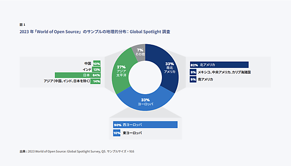 データ収集は、2023年4~6月にかけて実施され、人口統計、オープンソースの利用および貢献の現状、オープンソースの利用および貢献の利点と課題、オープンソースの価値提案、オープンソースの持続可能性といった分野の質問が含まれています。また、地域的には、下図にあるようにさまざまな地域からのデータを集めることができ、偏りがないように見えます。