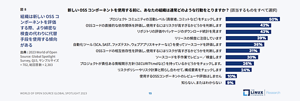 また、安全性という観点では、OSSはクローズドソースソフトウェアよりも安全であるという考え方が一般的(回答者の68%が同意)ですが、OSS利用を制限する要因については「OSSコンポーネントのセキュリティについて懸念」を回答者の42%が挙げています。これは、OSSは全体的に安全であると認識しているが、特定のコンポーネントやプロジェクトに疑念を抱いている可能性があることを示唆しています。新しいOSSコンポーネントを評価する場合、時間のかかるソースコードの直接的なチェックを行う代わりに、下図にあるような活動レベルやリリースの頻度などの情報をチェックするなどの代替手段を活用しています。