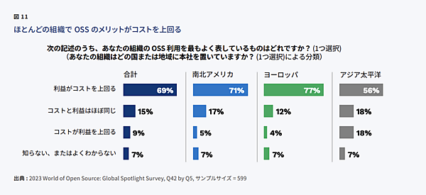 下図のように、ほとんどの地域でメリットがコストを上回ると回答していますが、欧米に比べてアジア太平洋が低くなっています。前述したように、アジア太平洋では、まだOSSの価値について認識されていないことが反映されているのかもしれません。