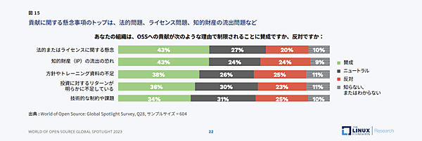 よく話題になる「知的財産の流出に対する恐れ」や「法的およびライセンス上の懸念」は当然のように上位に入っていますが、38%が「方針やトレーニング資料の不足」を挙げていることを考えれば、明確に定義されたガイドラインや教育リソースが必要なことが分かります。また、金銭的な見返りがないことも障壁になっています。このような障壁を乗り越えたところにOSSの持続可能性が達成されるということになります。