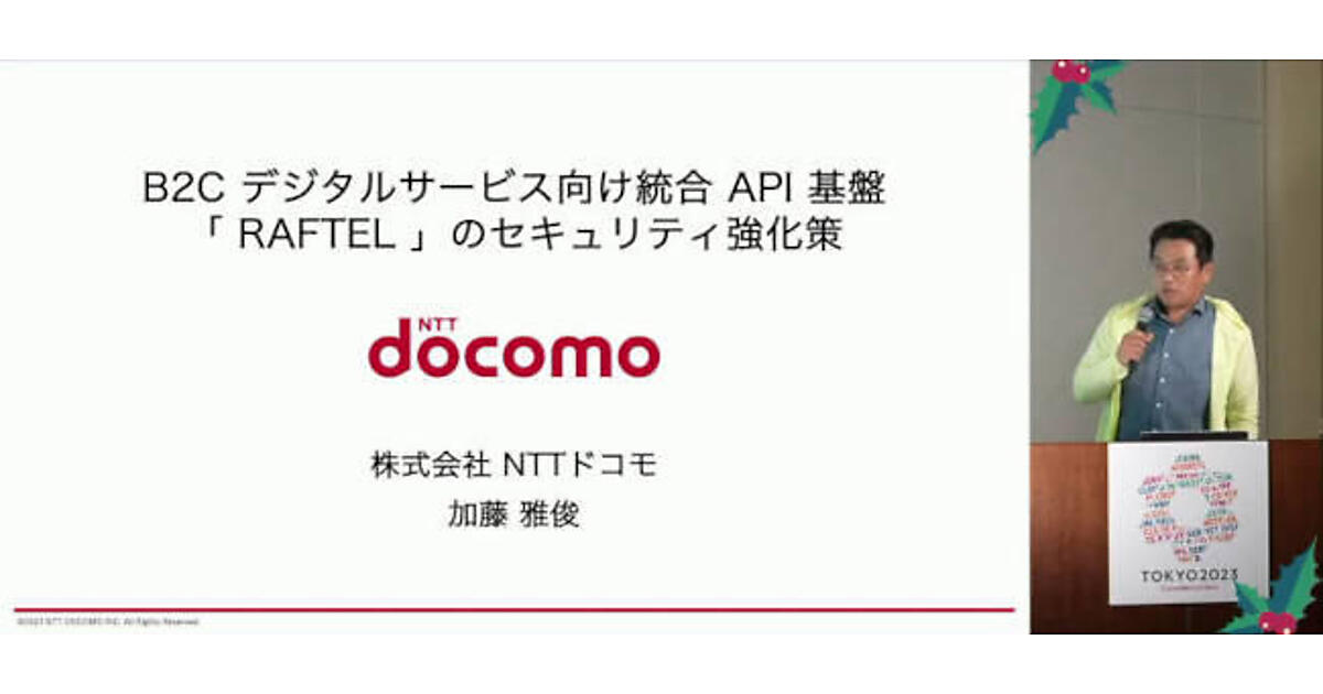 タイトルは『B2Cデジタルサービス向け統合API基盤「RAFTEL」のセキュリティ強化策』。同社のAPI基盤のリニューアルと、そこにおけるコンテナセキュリティ製品「Sysdig」などを採用したセキュリティ強化およびDevSecOpsへの取り組みについて紹介がなされた。
