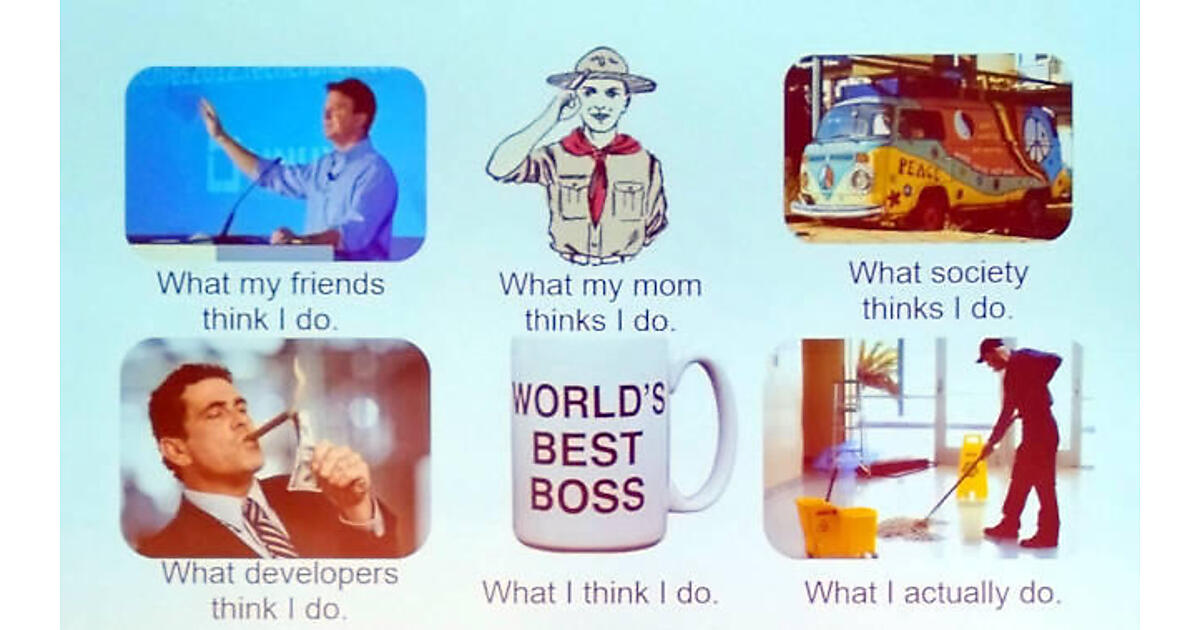 Zemlin氏はLFでの仕事について、外部から見える姿と実際にやっている仕事には大きな違いがあるとして、カンファレンスでのプレゼンテーションなどの派手な部分だけが強調されがちだが、実際には掃除人のような地味で目立たないが必要な仕事をこなす役割であると説明し、会場からの笑いを誘った。