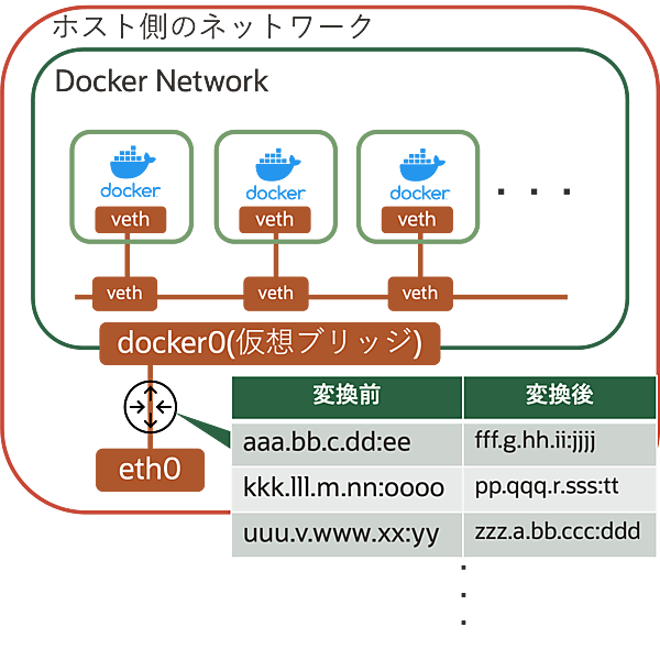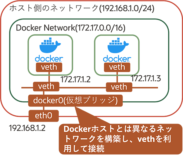 docker0(仮想ブリッジ)というbridge networkを作成- コンテナ側とDockerデーモン側のネットワーク(≠ホストネットワーク)をvethペアで接続