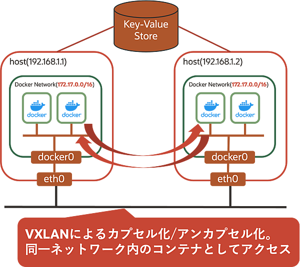 overlay networkはVXLAN(L2 over L3)の技術を利用して実現するもので、Dockerホストが異なる拠点やデータセンタに存在しても、同じネットワーク上に存在しているものとしてアクセスできます。overlay networkにはKVS(Key-Value Store)が必須になっており、Dockerホストのディスカバリなどに利用します。Key-Value StoreはConsul/etcd/ZooKeeperをサポートしています。