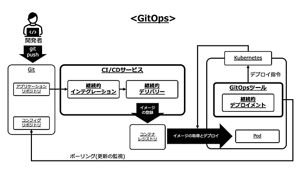 こうしたデプロイ方式は「GitOps」と呼ばれています。GitOpsは、2017年に英Weaveworks社が提唱したデプロイ手法です。GitOpsではシステム全体のコンフィグが宣言的に記述され、すべてがGitの管理下に置かれます。そして、このGitリポジトリを唯一の信頼できるソースとして扱うことが名前の由来となっています。