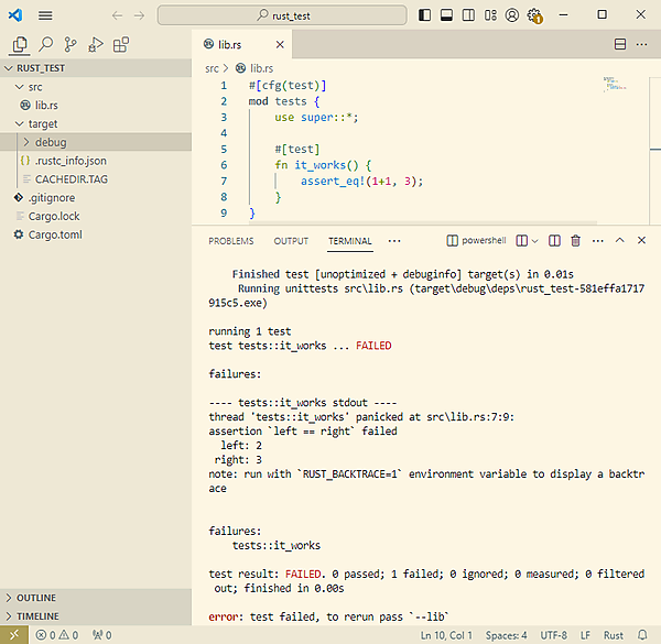 次のテストを実行すると「tests::it_works」が「test result: FAILED. 0 passed; 1 failed; 0 ignored; 0 measured; 0 filtered out; finished in 0.00s」と表示されます。「test result: FAILED.」でテスト結果が失敗を表しています(図2)。