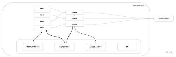 Autoscalerはアプリからのデータを収集してバックエンドに送るコレクタを管理します。データ量の変動に応じてコレクタをオートスケールさせます。Scheduler は自動計装されたアプリとコレクタを紐づけます。