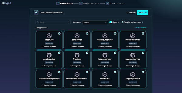UIは対象のアプリを選択したりデータの送信先バックエンドを選択したりする画面を提供します。odigos-uiという名前のServiceをポートフォワードしてWebブラウザで表示します。
