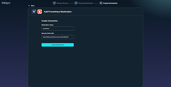 最終的に下表の3種類を設定しますが、セットアップ画面では1種類しか設定できないので、まずPrometheusを設定します。Destination NameとEndpointを入力します。