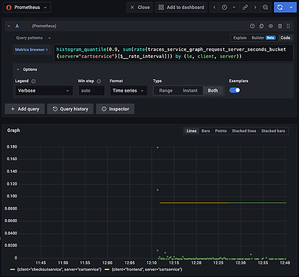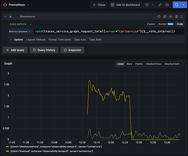 サービス間グラフから、関連する一部のメトリクスが参照できます。グラフ中のサービスのノード(例えば、cartservice)をクリックするとメニューが表示されます。[Request rate]を選択すると、右側にPrometheusのデータソースでそのサービスに対するリクエストレートが表示されます。