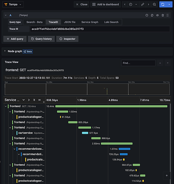 いずれかの点にマウスオーバーすると、そのリクエストに関する情報が表示されます。「traceID」の横に表示される[Query with Tempo]ボタンをクリックすると、Tempoデータソースでトレースが表示されます。