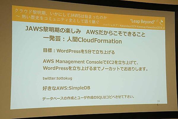 「AWS CloudFormation」が登場したとき、得上氏は「人間CloudFormation」という一発芸に挑んだ。逆説的にCloudFormationの便利さを伝えるものだが、流れるような作業を称賛する声も多く好評だった。後には、本物のCloudFormationとの対決も行われ、当時の勉強会会場を沸かせたという。