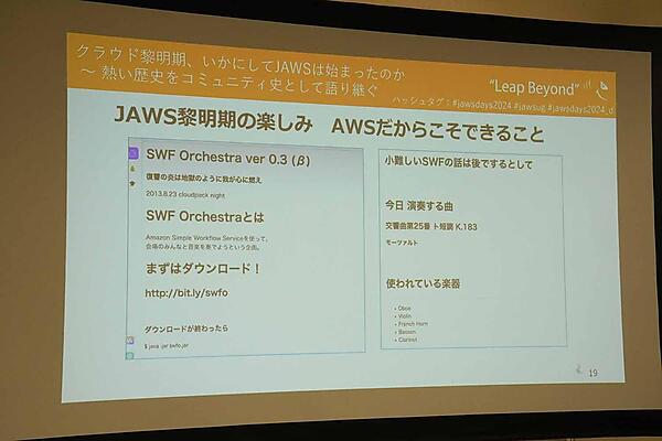 「Amazon Simple Workflow Service」が登場したときには、最適な使い道はオーケストラ演奏(?)なのではないかという仮説のもと「SWFオーケストラ」というデモアプリを作った。参加者の各PCにWorkerをダウンロードしてもらい、それをAmazon SWFで時間同期させる。各WorkerがMIDIで1台ずつ楽器を演奏し、オーケストラを再現しようという、遊び心に溢れた企画だった。