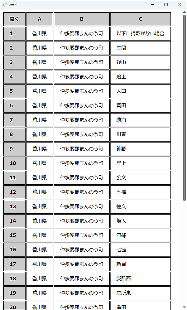 図3のように50音だけでなく、たいていのxlsxファイルのセルの文字列が読み込めます。ただしA~Zの26列までしかヘッダーは対応していませんが、行数はメモリの許す限り読み込めると思います。