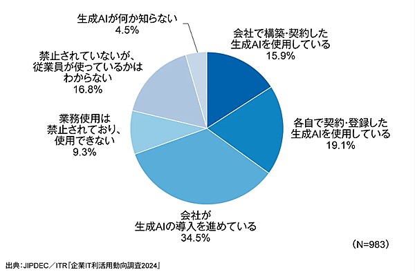 - 生成AIの使用企業は35.0%、導入進行中が34.5%となり、今後急速な拡大が見込まれる