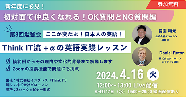 また、4月16日(火)の12時からは「Think IT流+αの英語実践レッスン~初対面でも仲良くなれる! 初対面で聞いてOKな質問・NGな質問編」のウェビナーを開催します。ウエビナーでは、今回の記事では取り上げないOK・NGの質問を紹介しますので、ぜひご参加ください。今回の記事を読み、さらにウェビナーにも参加すれば、もう初対面の会話で失敗することはありません!