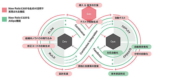 図1:New RelicのAIOps & 生成AI機能によるDevOpsサイクルの効率化イメージ