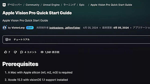 Epic Games、Unreal EngineのApple「Vision Pro」向けチュートリアルを公開。手続きは煩雑もUEでビルド可能に