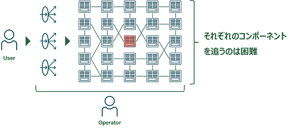それが、クラウドネイティブにおける分散システムのような小さなサービスが疎結合するマイクロサービスのシステムでは、構成が複雑となり障害発生個所の特定や原因追及がこれまでのアプローチでは難しくなります。