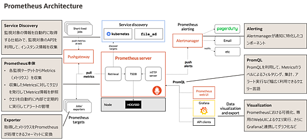 PrometheusはPull型で、監視対象システムのExporterという軽量なHTTPサーバにリクエストを送信して、レスポンスを受信する仕組みです。Prometheusにはサービスディスカバリ機能が実装されているため、監視対象のリスト(IPアドレスやポート番号など)を動的に更新して運用への影響を回避できます。