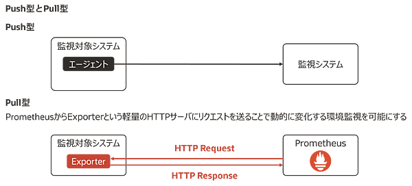 ここで、メトリクス収集におけるPush型とPull型を整理します。Push型は監視対象システムにエージェントをインストールして、そのエージェントから監視システムにメトリクスを送信します。Pull型は監視システムから監視対象システムのメトリクスを受信します。
