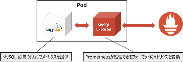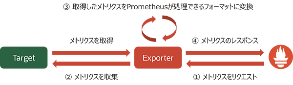 Exporterはターゲットが持つ独自形式のメトリクスをExporterが取得して、Prometheusが処理できるフォーマットに変換する役割を担います。