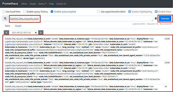 PrometheusのWeb UIを利用してフォームにPromQLを入力し、実行すると結果を表示できます。メトリクス名、ラベルフィルタリング、正規表現フィルタリングなどが行えます。