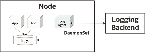 ログエージェントをDaemonSetとして各ノードに配置し、ログを転送する方法です。コンテナランタイムが出力するログファイルのディレクトリを監視してラベルなどの情報を付与して転送します。Kubernetesのノード単位でログを集約できます。