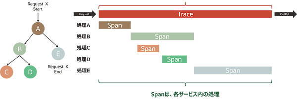 例を挙げて、もう少しトレースの中身を見ていきます。例えば、AからEの処理を実行するリクエストがある場合に、全体をTrace、各処理をSpanとして各処理で要したSpanの時間を見てパフォーマンスのボトルネック状況を確認し、処理の全体像を把握します。
