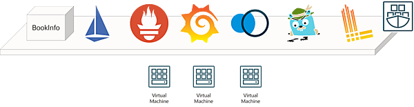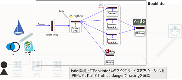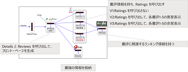 Bookinfoは書籍情報を表示するマイクロサービスアプリケーションです。各言語で作られたアプリケーションサービスが疎結合して、1つのシステムを形成しています。