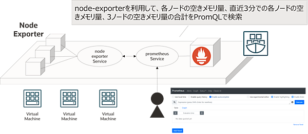 Prometheusのデモでは、node-exporterを利用してKubernetesクラスタの各ノードの空きメモリ量、直近5分における各ノードの空きメモリ量、3ノード全体の空きメモリ量の合計をPromQLで検索し、WebUIで確認するデモを実施しました。