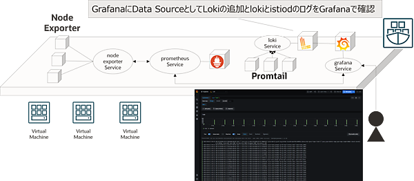 Grafana LokiのデモではGrafanaにData SourceとしてLokiを追加し、lokiとistiodのログをGrafana のWebUIで確認するデモを実施しました。