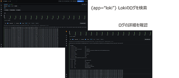 検索フォームに以下を入力して、lokiのログを検索して確認します。