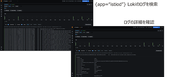 {app=“loki”}検索フォームに以下を入力して、istiodのログを検索して確認します。