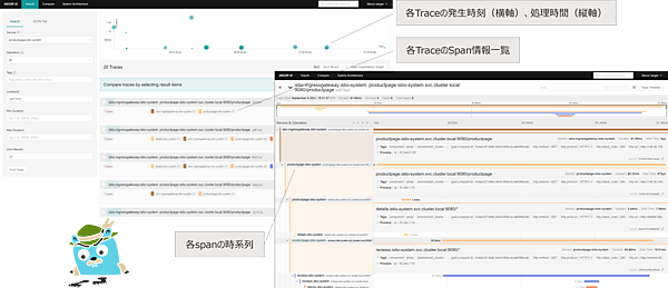 JaegerのWebUIを利用して、処理におけるTraceとSpanの状況を確認しました。
