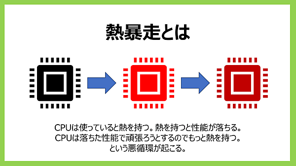 このように、パソコンの中には発熱する部品が様々に含まれています。では、なぜそれらの部品は発熱するのでしょうか。それはぜひご自身の手で調べてみてください。そして、コンピュータが熱を持つと何が問題なのか、それも調べてみてください。
