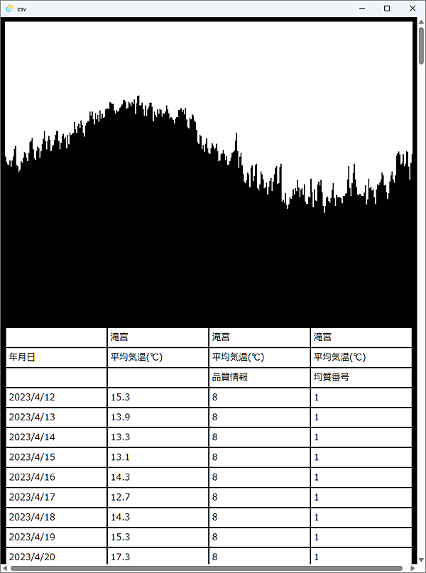 CSVデータの例として、気象庁のWebサイトから無料のCSV形式のファイルをダウンロードして使います。気象庁ではカスタマイズして気象データをダウンロードできますが、今回は1地域の1日ごとの平均気温を1年間分だけ取得し、図1のように1年間の平均気温のグラフと、数値のテーブル表をWebページで表示するデスクトップアプリを開発します。
