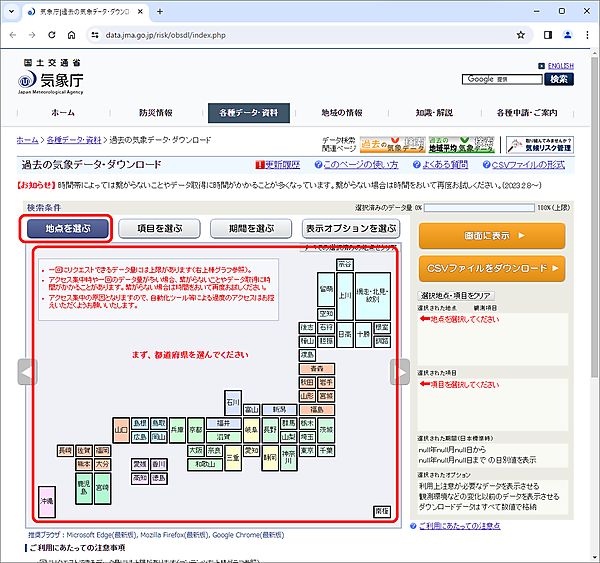 それでは早速、気象庁の気象データをダウンロードするページにアクセスしましょう。「気象庁|過去の気象データ・ダウンロード」というタイトルのWebページが開かれます。