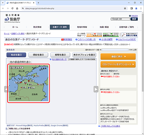 - 図2のように「地点を選ぶ」ボタンを押して、任意の「都道府県」を図から1つ選びます。