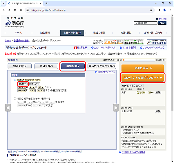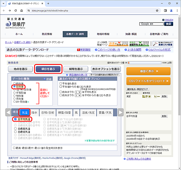 - 図4のように「項目を選ぶ」ボタンを押して「データの種類」を「日別値」だけ、「項目」を「気温」の「日平均気温」だけのチェックボタンを押します。