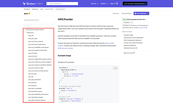 リソースタイプに指定できる値はプロバイダーのドキュメントページ左側にあるツリーから確認できます。