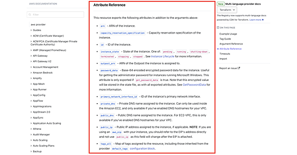 参照できる値はリソースタイプのドキュメント下方にある「Attribute Reference」の項目で説明されています。