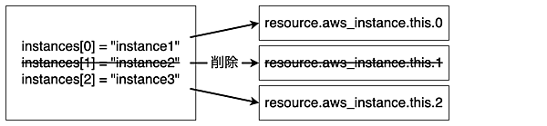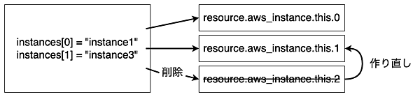 listは途中のインデックスを削除すれば後続の値が繰り上がってきます。リソースを管理しているインデックスが変更となるため、リソースの再作成が発生します。