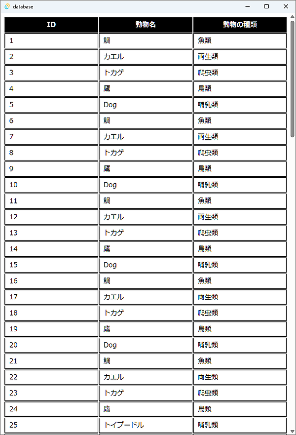 let html = "<tr><th>ID</th><th>動物名</th><th>動物の種類</th></tr>";