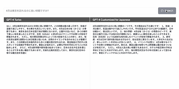 GPT-4のカスタムモデルを日本語向けに最適化しました。日本語テキストの性能向上と、GPT-4 Turboより最大3倍高速な動作を提供します。
