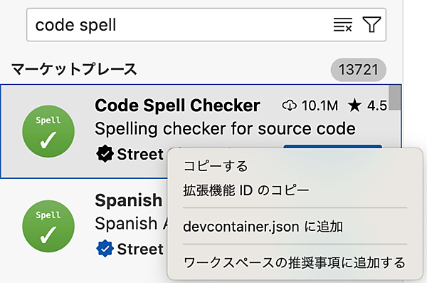 試しにコードのスペルチェック拡張機能を自動でインストールされるようにdevcontainer.jsonファイルに追加してみます。拡張機能のサイドバー(表示 > 拡張機能)を開きcode spellを検索します。ここで通常はインストールボタンを押してインストールしますが、今回は割愛します。