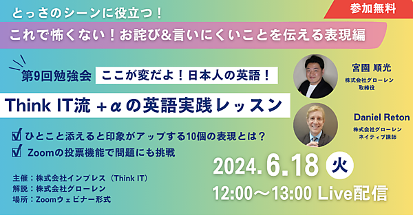 「Think IT(シンクイット)」が主催する主に読者のエンジニア層を対象とした英語実践セミナー「Think IT流 +αの英語実践レッスン」では、英語シリーズの第9弾として、「英語でのお詫び」と「言いにくいことを伝える」表現を学ぶ「ここが変だよ!日本人の英語!やりなおしの英語実践レッスン特別版~これで怖くない!お詫び&言いにくいことを伝える表現編」を6月18日(火)にオンライン開催します。