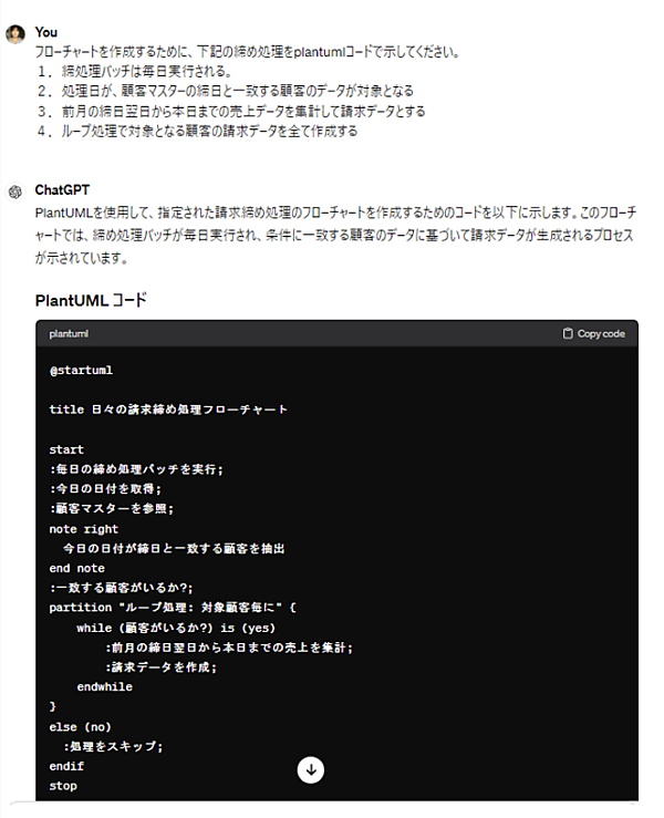 上記に1行処理を追加したプロンプトを用いてChatGPT4にplantumlコード作成を依頼すると、図3のようにPlantUMLコードを作成してくれます。フローチャートを作成するために、下記の締め処理をplantumlコードで示してください。